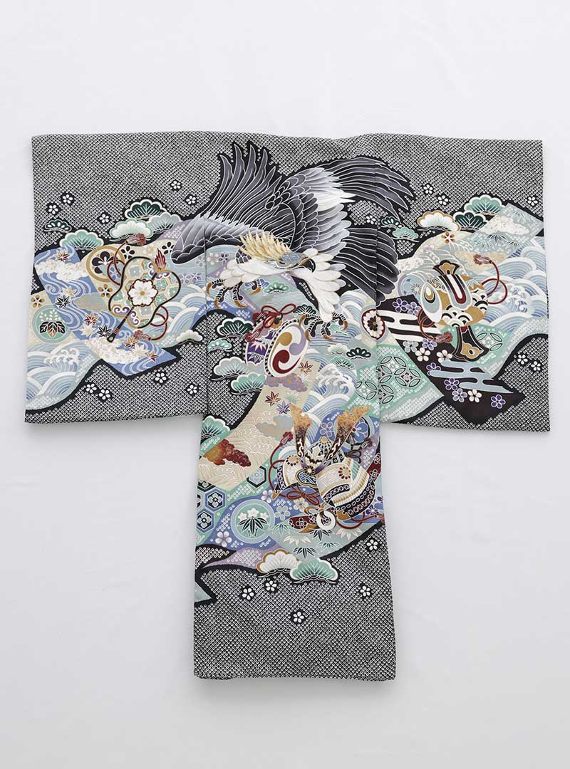 黒のしぼり柄の着物の中に立派に描かれた鷹や兜、軍配。男の子の着物の柄に良く描かれている人気の模様が沢山デザインされた華やかで豪華な祝い着です。 模様にはそれぞれ意味があり、軍配には軍配を持つリーダーのように「知力・決断力・行動力にあふれ、先頭に立ち人を動かせる男の子に成長するように」という願いが込められた祝い着です。