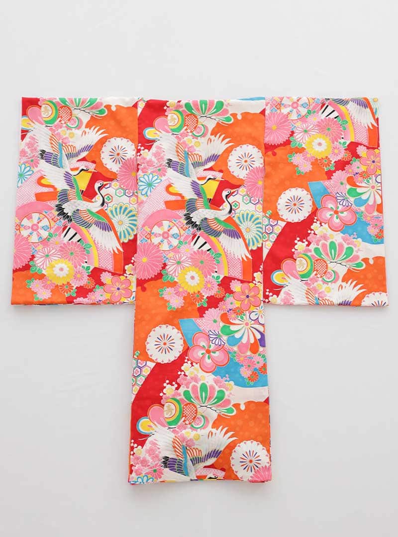 鮮やかなオレンジやピンク・水色の組み合わせがポップでキュートな1着。鶴や松は「長寿」・扇は「未来への展望が明るい」・梅は「五穀豊穣(ほうじょう)」や「繁栄」という意味がそれぞれ込められています。 古典的なモチーフが多いですが、色合いがカラフルなのでレトロポップで元気な印象を与えてくれます!家族撮影では祝い着を引き立てるような白や落ち着いた服装がオススメです!