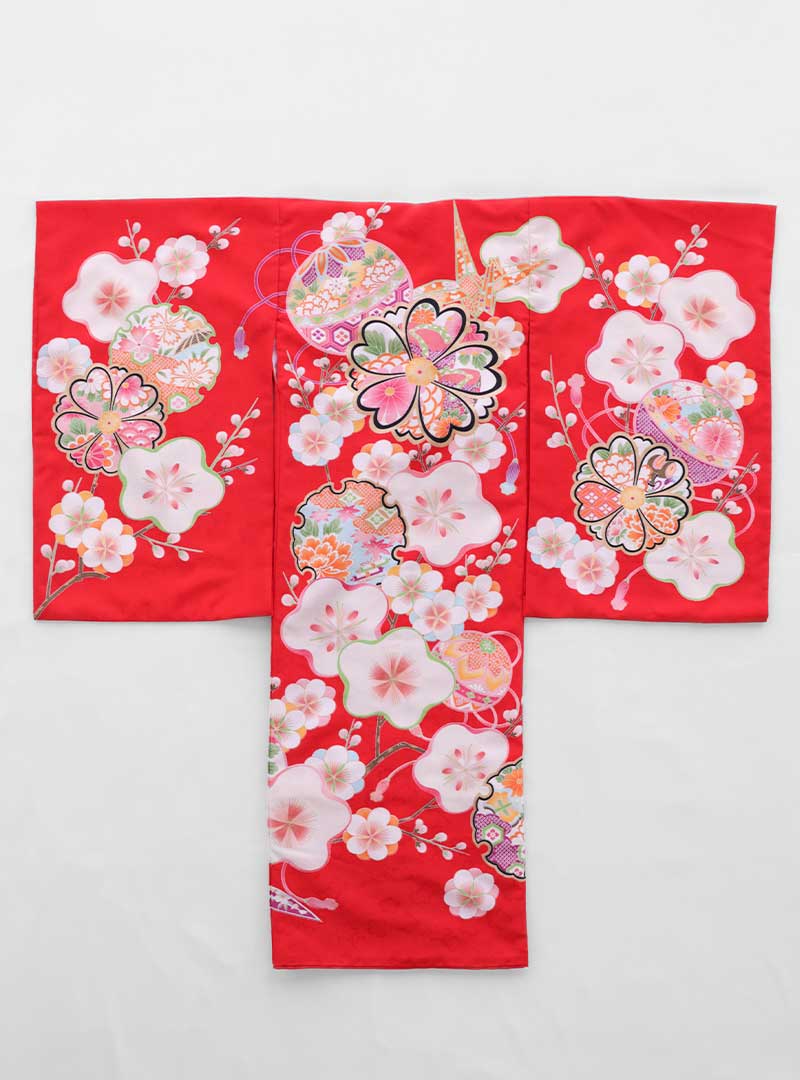 鮮やかな赤地に、繊細な桜や菊の花模様が施されており、華やかさと上品さを兼ね備えた日本の伝統的な美しさを象徴している祝着です。 花々の間には、伝統的な日本の模様が描かれ、色とりどりの糸で刺繍されたような立体感があります。 伝統的な毬の模様が施されており、子供の成長と幸福を願う気持ちが込められています。 鮮やかな赤色なので赤ちゃんの白い肌が映え、お子さんの特別な日を一層華やかに彩る一着です。