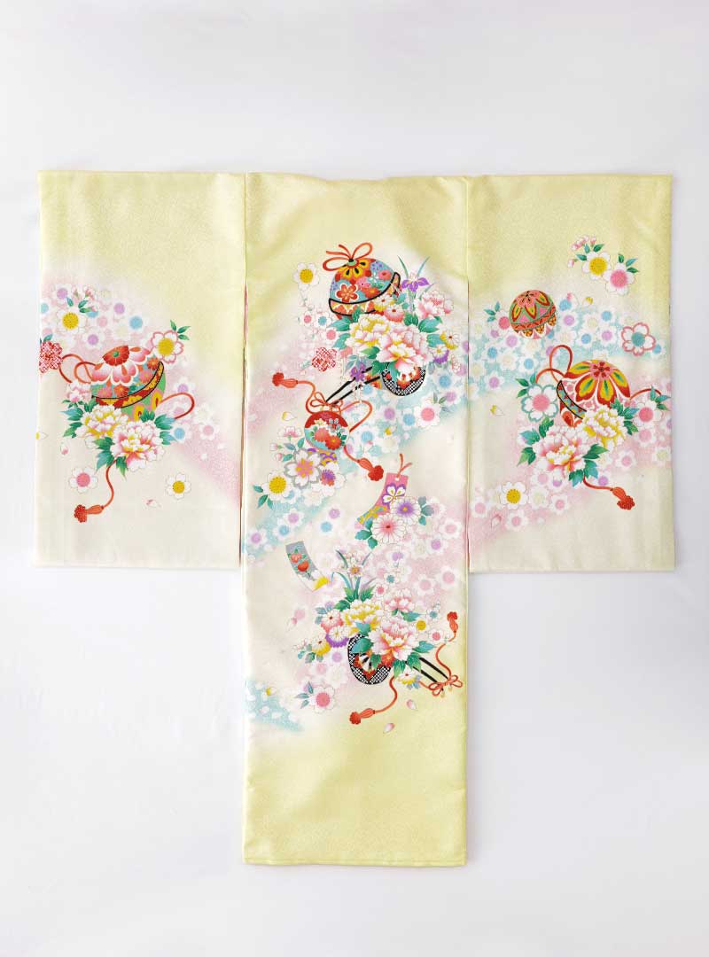 「毬(まり)」の柄は、その形から「何事も全て丸く収まりますように」「丸々と、豊かに健やかに成長しますように」「高貴や気品」を表します。また毬は長い糸を使って用いられることから「良い人に出会えますように」と良縁祈願にも用いられる柄です。 「鈴(すず)」の柄は、鈴の音には魔物や獣を追い払い神や縁起の良い物を引き寄せる力があり音で神様を呼び「この子をよろしくお願いいたします」とお願いをするためと言われています。とても華やかな柄です。