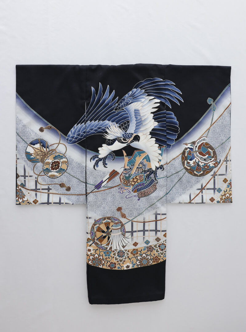優雅なデザインが施されたこの着物は、力強く羽ばたく鷹が描かれ、勇敢さと高貴さを象徴しています。黒地に広がる美しい青のグラデーションが、鷹の躍動感を一層引き立てます。 伝統的な柄と繊細な装飾が調和し、洗練された美しさを持つ一着です。格式高い場面での装いにふさわしい、特別な存在感を放つ一着です。
