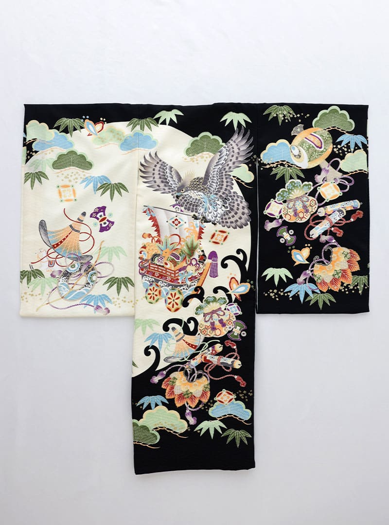 白と黒の大胆な配色が特徴的な和装です。力強く羽ばたく鷹が中心に描かれ、周囲には伝統的な吉祥文様があしらわれています。躍動感あふれるデザインが、着る人の力強さと気品を引き立てます。 色彩のコントラストが美しく、見る者を魅了する一着です。格式高い場にふさわしい、気品と力強さを兼ね備えた装いで、特別な日の記念としてもピッタリです。