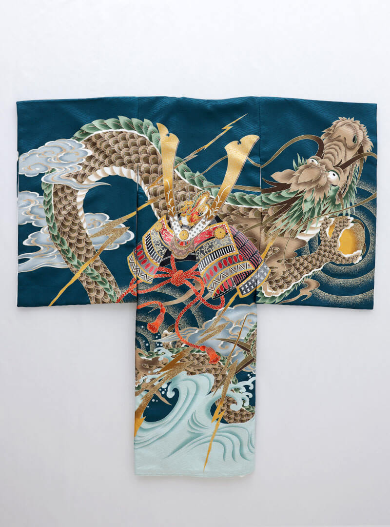 この美しい衣装は、日本の伝統的な美意識を体現しています。シックな色調の中に浮かぶ松の木や鶴の模様は、長寿や幸運を象徴し、デザイン全体に優雅さと調和をもたらしています。 幾何学模様が背景に控えめに描かれ、モダンな要素も感じられるこの装いは、伝統と現代の融合を見事に表現しています。