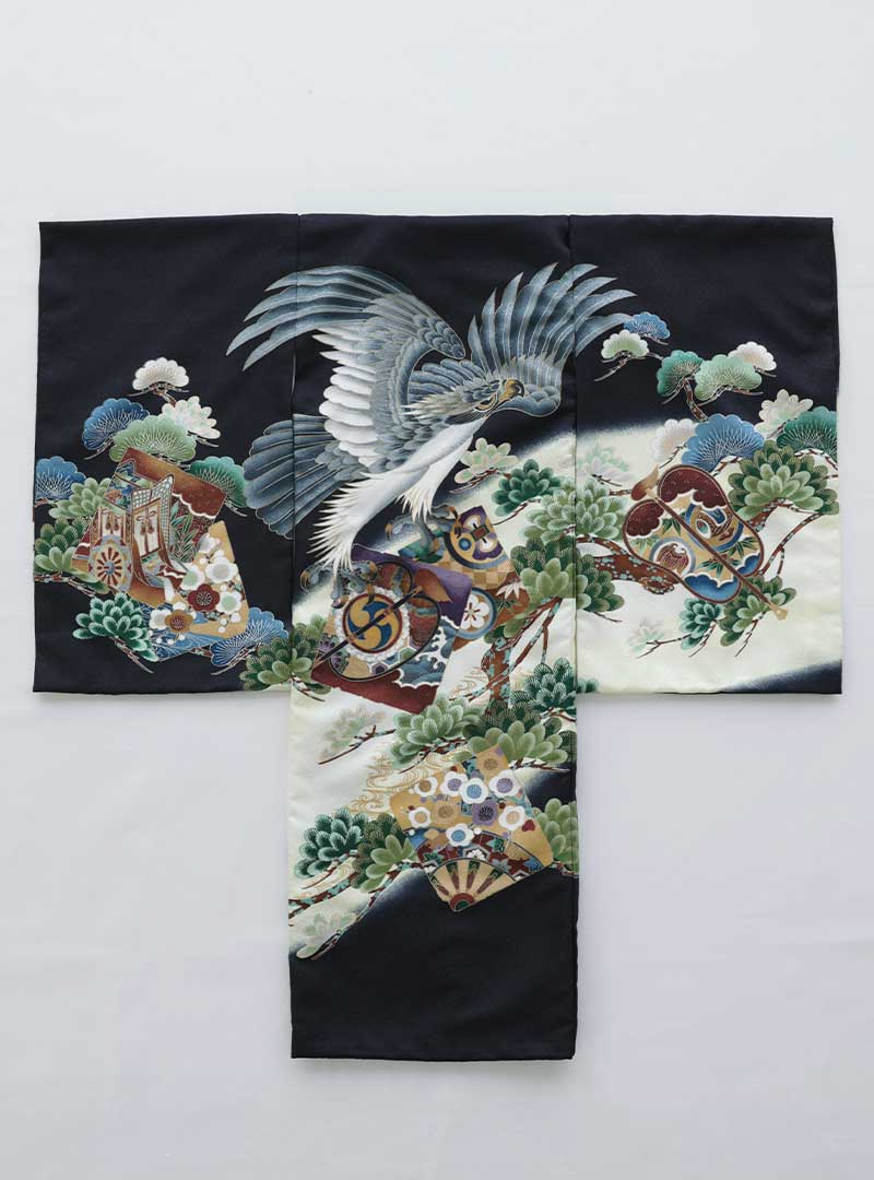 深い黒地に描かれた美しい鷹の絵柄が特徴的な定番の一枚です。伝統的な日本文化を色濃く反映しています。黒は日本文化において格式が高く重厚感を感じさせ、翼を力強く広げる鷹は高貴な動物として重要な位置を占めています。 強い存在感を持ちながらも華やかさと優雅さを兼ね備え、自由や力を象徴していて見る人に勇気や希望を与えます。