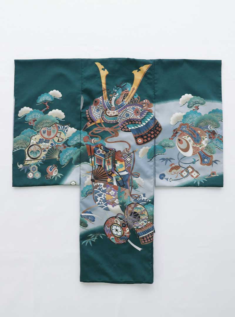 深い緑色を基調とした文化的なシンボルが豊かに表現されたデザインの一枚です。着物の基調となる色は深い緑色で自然の豊かさや生命力を象徴しています。また、心を落ち着ける色とされ日本の自然や四季を感じさせる色合いです。 兜、扇子、鼓はそれぞれが特有の意味を持ち力強さや幸運、喜びやお祝いを象徴しています。特に鼓の音は生命の鼓動や活力を象徴しているため、元気なお子様にはぴったりの着物です。