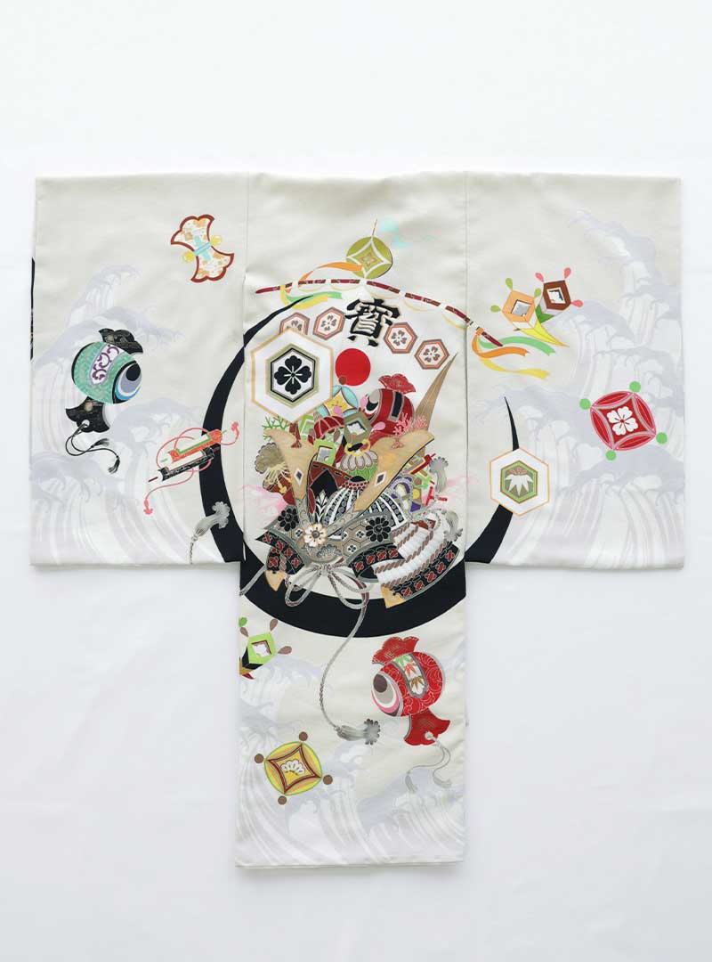 非常に華やかな色彩豊かなデザインの一枚です。明るい白地は清楚でありながらもデザイン上のどんな色も引き立てる役目を果たしているため、黒や赤、黄色といった色が目立ち、元気で明るい印象を与えます。中央に描かれた円形のデザインは調和や円満を象徴し全体のバランスを取っています。 清潔感のある明るいイメージで撮影したい方におすすめです。