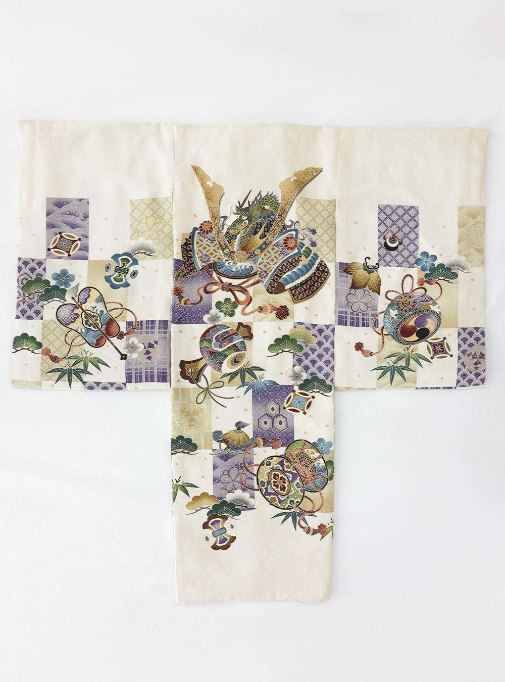 「兜(かぶと)」の柄は、「邪気や災難から守り健やかな成長を願うお守り」の意味があります。また武将の中でも身分の高い人だけが着用を許されて居たことから「男の子の出世や一家の長として立派に育って欲しい」という意味も込められています。 色味は白で、とても品際立つ着物です。