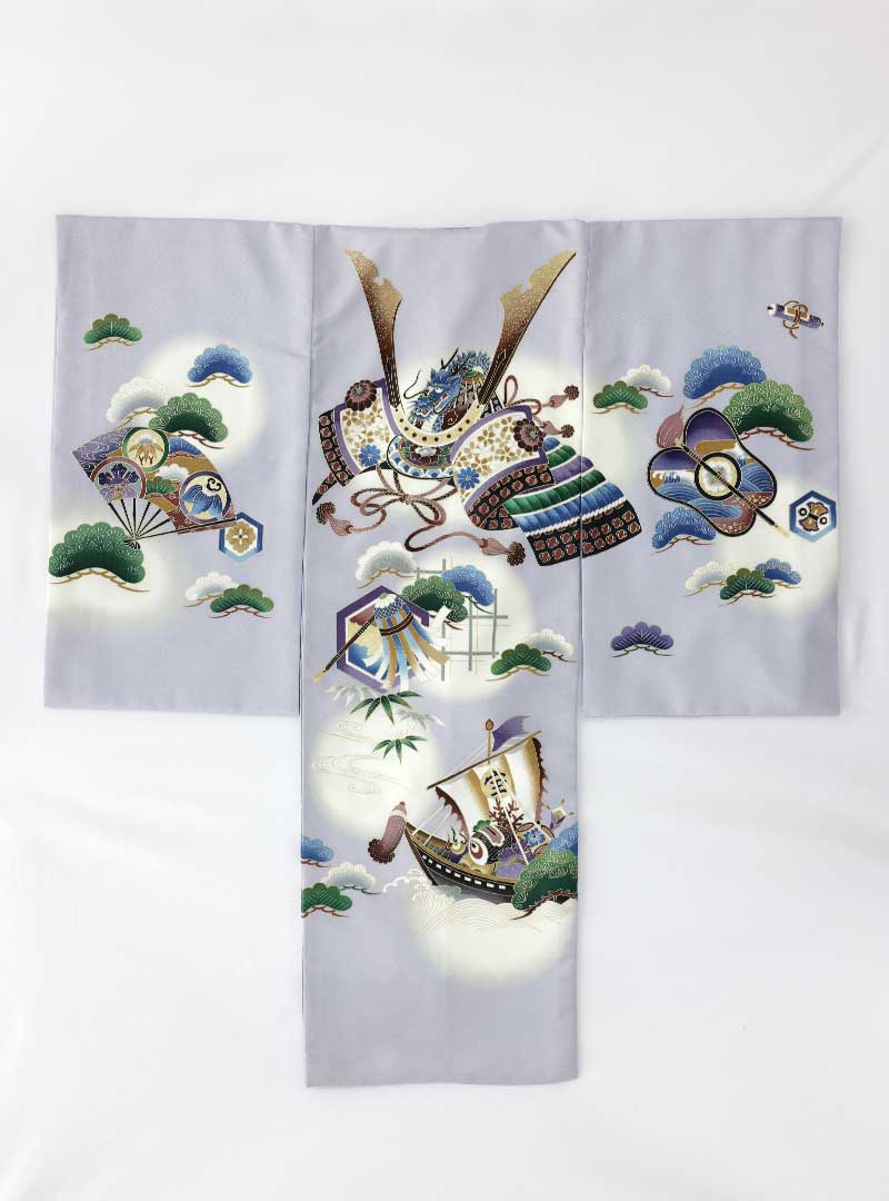 「兜(かぶと)」の柄は、「邪気や災難から守り健やかな成長を願うお守り」の意味があります。また武将の中でも身分の高い人だけが着用を許されて居たことから「男の子の出世や一家の長として立派に育って欲しい」という意味も込められています。 薄めの紫の品のある色味とデザインです。優しい雰囲気が好きな方におすすめです。