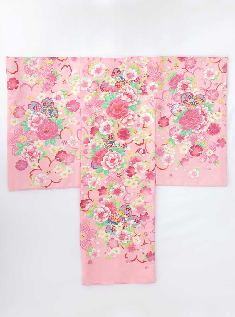 「桜(さくら)」の柄は、縁起の良い柄だとされています。さくらの「さ」は稲、「くら」は神が宿る座を意味しています。またいっせいに咲き誇る姿から「繁栄」「豊かさ」という意味も持っています。 とても可愛らしい薄いピンク色の着物で、女の子らしい色味が人気の祝い着です。