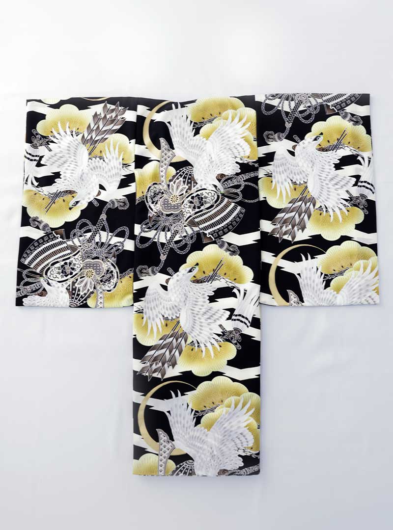 黒地に白鷹、金の松が大胆に描かれ配色の豪華な紅一点のブランド祝着。兜は、戦の際に頭を守ってくれる防具のため、お子様の身を守ってくれるものです。災いや邪気を払い、健康に育ってくれるようにとの願いが込められています。 日本の伝統的な古典柄を現代風にアレンジしたこの着物は、他にないデザインの個性豊かな祝着です。