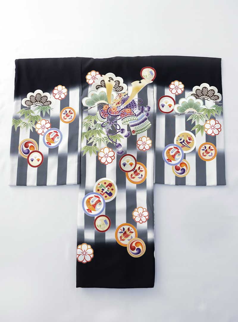 伝統的な和柄をポップにモダンにアレンジした乙葉のブランド祝着。黒と白のストライプを背景に色とりどりの模様が散りばめられ、おめでたい吉祥文様がいくつも描かれています。 松竹梅のモチーフが日本の四季や自然美を表現しています。中央には勇壮な兜が描かれ力強さを感じさせます。モダンな中にも古典の味わいを感じさせてくれる祝着です。
