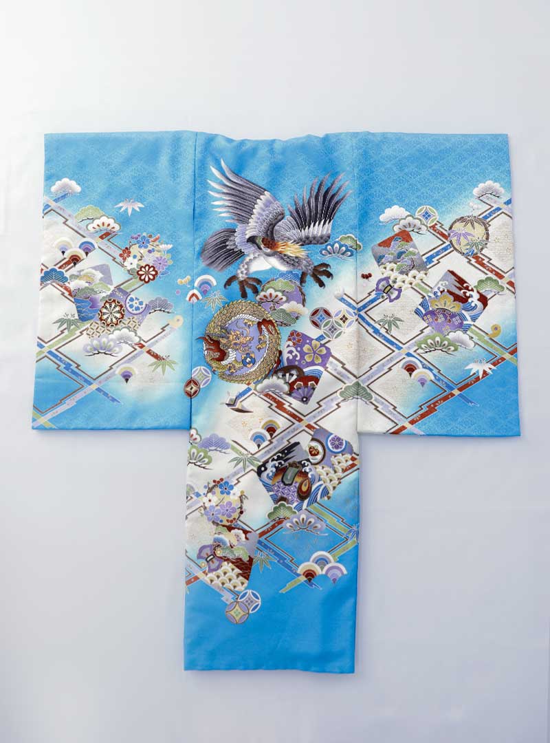 空を舞う大きな鷹を中心に吉祥のシンボルとされる、松・竹・梅が全体に描かれた伝統古典柄の美しい祝着。 四季を通して青々と茂る常緑の「松」、天に向かってまっすぐに育つ「竹」、春に真っ先に美しい花を咲かせる「梅」この組み合わせで、生命の輝きと力強さを表すとされ日本では縁起物として親しまれています。