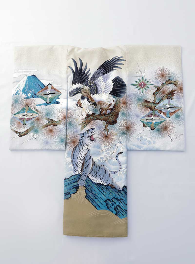 上品な気品感じられるベージュの生地に鷹や虎が勇ましく描かれた祝着。生命力を感じさせ古来より縁起物とされる松と、荒々しく描かれた波がより一層勇敢さを引き立てます。 虎が吠える姿は出世を意味し虎のように強く、たくましく育って欲しいと願いが込められている。日本のエネルギーの源とされる富士山が描かれているのも特徴的です。