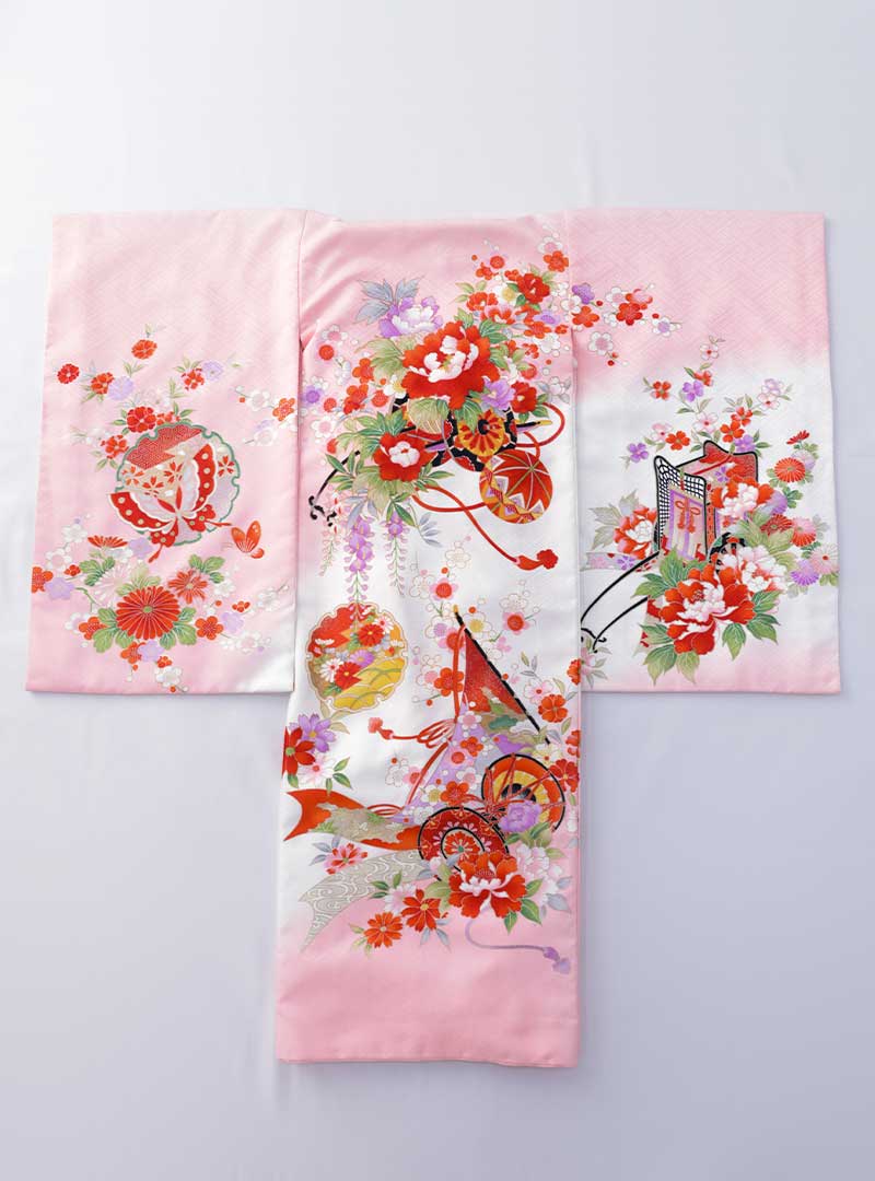柔らかなピンクを基調とし、華やかな花々や伝統的な吉祥文様が描かれた美しい祝着。描かれた花車からは、たくさんの花々が溢れています。幸福の象徴である花に満たされた様子から、幸せに溢れますようにとの意味が込められています。 また女の子の美しい成長と人々からの祝福を願う気持ちがこめられているようです。