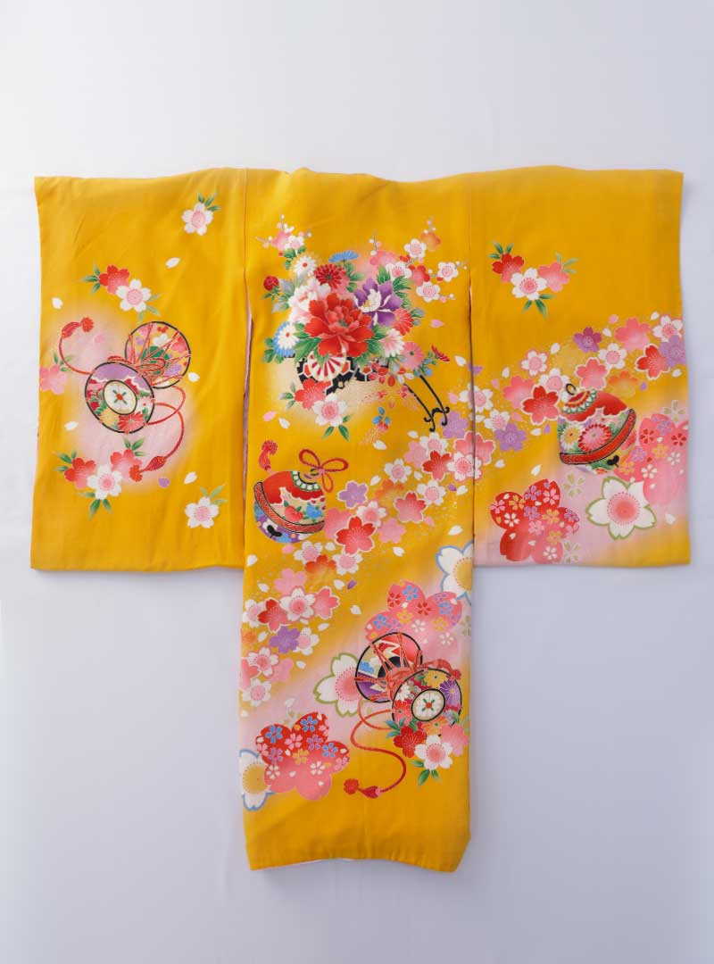 鮮やかなオレンジにうっすらピンクの流れるように描かれた花々。全体に散りばめられた無数の桜は吉祥文様のひとつで、「豊かさ」や「繁栄」を表す縁起の良いものとされています。 そして祝着の柄によく描かれいる「鈴」は、神様に呼びかけて祈りや願いを届けるという意味が込められています。健やかな成長を願うお宮参りに最適な祝着です。