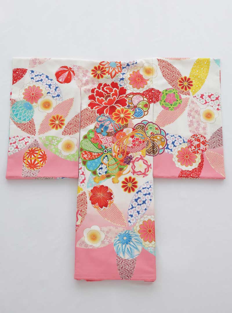 パステルカラーのピンクやイエローを中心に、女の子の着物の柄に人気の模様が沢山描かれた可愛らしいデザイン。カラフルな鞠が沢山描かれていて、鞠には縁を結ぶ・縁をつなぐとして、「縁起がよく良縁に恵まれる」丸い形状から「丸々と元気に育つように」という願いが込めてあります。 これからのお子様の成長を願うお祝いの日にピッタリな1着です♪