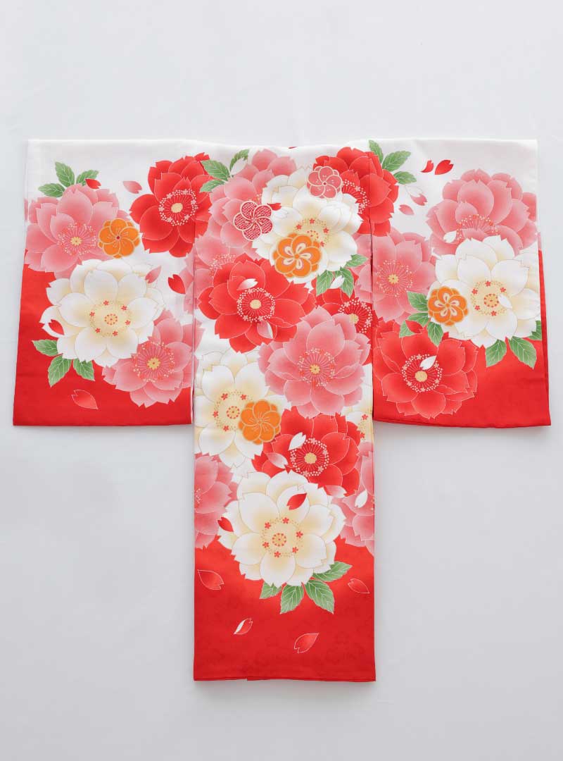 大きく咲いた沢山の牡丹花がとても華やかで綺麗に描かれた祝い着。牡丹は花が大輪で、花弁がとても美しいことから「花の王」とも言われ、「富・繁栄・幸せ」の象徴と呼ばれています。 大柄の花々がインパクトのある祝い着なので写真映え間違いなしの1着です。お子様のこれからの成長を願うお祝いの日にピッタリな祝い着です♪