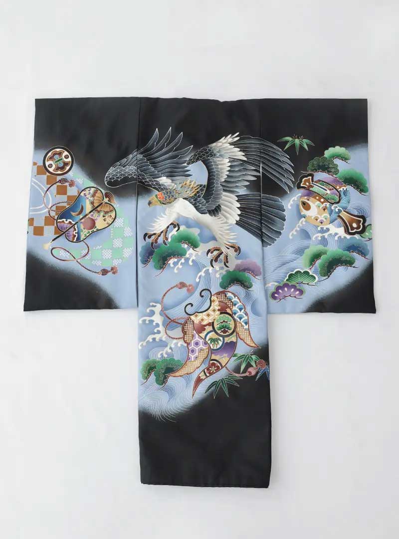 黒色を基調とし、中央には大きく鷲が描かれており、その周囲には波しぶきや岩、植物などが描かれ、鷲の羽の表現や波の躍動感など、非常に細密な描写が特徴的です。日本の伝統的な吉祥の図柄である鷲が、力強くダイナミックに描かれ、鷲の動きに合わせて力強く描かれた波は、躍動感と生命力を象徴しています。 力強さと躍動感あふれるデザインです。伝統的な絵柄がお子様の成長を願い、たくましさを表してくれます。