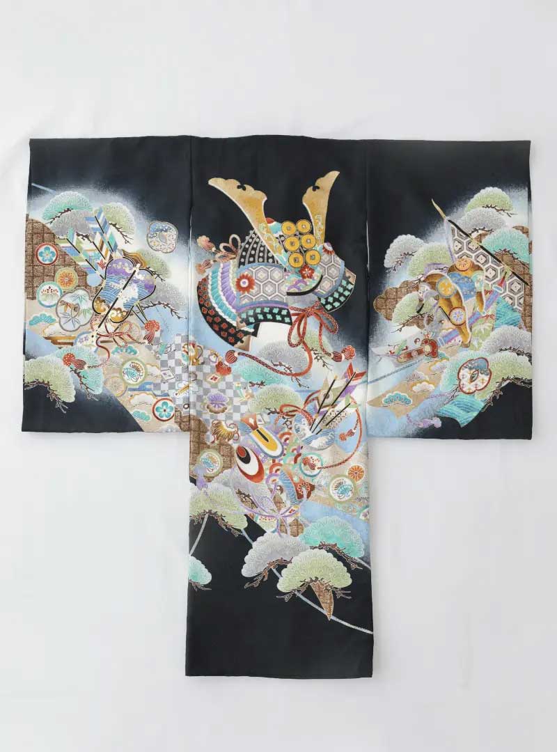 黒を基調としつつ、青や緑などの色が使われており、全体的に深みのある色合いの着物で、力強さや勇気を象徴する兜が描かれた産着です。兜の周囲には長寿や繁栄を表現する松や鶴が色鮮やかに描かれています。 さらに中央に大きく描かれた兜が男の子らしく強さを表し、かっこいい王道スタイルです。