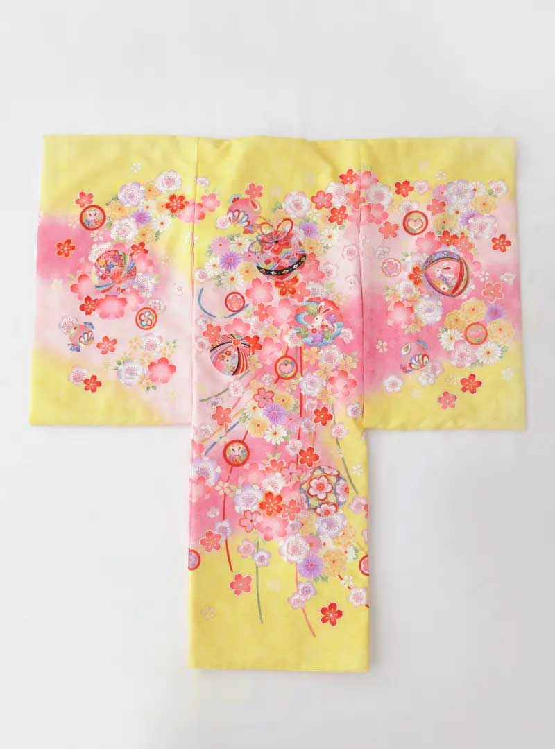 牡丹や桜など、様々な種類の花が描かれています。それぞれの色のコントラストが美しく、華やかさを増しています。鞠は、その形から「全てが丸く収まるように」「豊かに成長するように」との願いが込められています。様々な種類の花が咲き乱れ、華やかでめでたい雰囲気を演出しています。 古くから日本の着物に用いられてきた花柄や鞠などのモチーフを取り入れつつも、現代的な感覚も感じられるデザインです。羽織るだけでとても女の子らしい可愛さあふれる写真撮影が叶います。