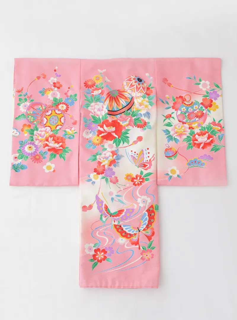 淡いピンク色の地に、様々な種類の可愛らしい花柄が散りばめられた、とても華やかなデザインです。生命の再生や魂の象徴である蝶が、ひらひらと舞っている様子が生き生きと描かれています。女の子の健やかな成長を願う気持ちが込められています。鞠は、丸く満ち足りた形から、すべてが円満にいくようにとの願いが込められています。 牡丹や桜など、様々な種類の花が咲き乱れ、華やかさを添えています。淡いピンク色を基調とし、これらの色の組み合わせが、着物全体に優しい雰囲気を与えています。
