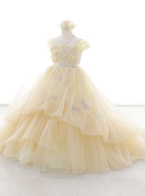 優しいレモンイエローに紫や水色の淡い花がちりばめられた豪華なドレスです。肩の部分はショルダーキャミタイプになっており、ウエスト部分にはシルバーのビジューや花がデザインされています。 スカートの部分は3段のティアードタイプになっておりボリューム満点。チュールの中に花が散りばめられており可愛らしい印象です。