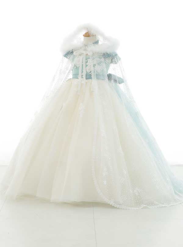 高級感のある淡いブルーがエレガントなロングドレスです。袖がパフスリーブになっており、おとぎ話の中のプリンセスのような華やかさを演出します。お花のコサージュが胸元やドレスにもほどこされ、シンプルながらも洗練された印象に。 お揃いのチョーカーとボレロをつければ雪の国の可愛いお姫様風に。ふわふわ感が引き立つ座りのショットがオススメです。