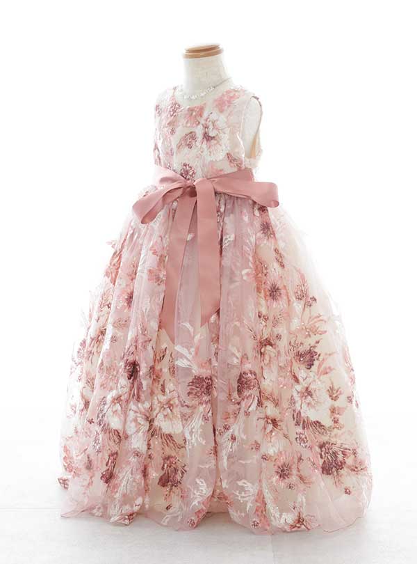 ドレス全体にほどこされた花柄の刺繍が繊細で可愛らしく、高級感のあるロングドレスです。オールドローズ色のサテンリボンがアクセントになっており、華やかながらも落ち着いた雰囲気を演出します。 レース素材の透け感が可憐な女の子らしさを引き立て、ふわふわとしたシルエットが柔らかく優しい印象を与えるドレスです。