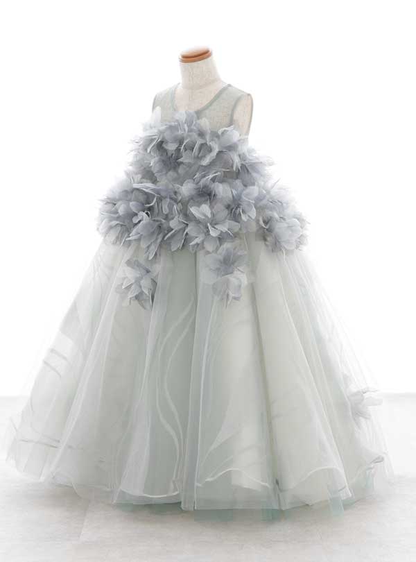 淡いグレーのチュール素材で作られたプリンセスラインのドレス。胸元には立体的なお花のモチーフがふんだんに飾られているため華やかでゴージャスな印象を与えます。落ち着いた色味が淡く優しく、韓国風のシックなくすみブルーの色味で落ち着きを感じさせ、柔らかく上品な雰囲気も醸し出します。 大きなリボンやお花をモチーフにした刺繍など、女の子が大好きな要素が盛り込まれており、プリンセスのような雰囲気を演出できます。