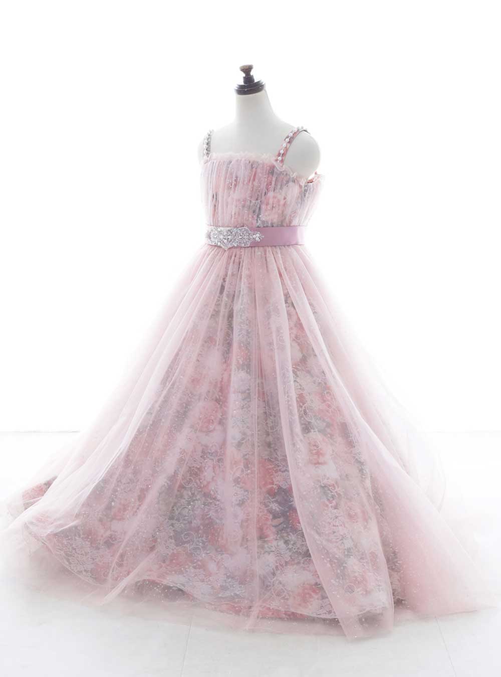 淡いピンクのドレスに、まるで花が咲き乱れるおとぎ話の主人公のようになれる1着。ふんわりとしたチュールが女の子らしさを引き立ててウエストのキラキラ輝くビジューベルトがアクセントに♪ 肩紐のデザインも可愛らしく、華やかでありながら上品な印象を与えます。女の子らしい可愛さを最大限詰め込んだドレスでお子様の晴れの日を彩ってください♪