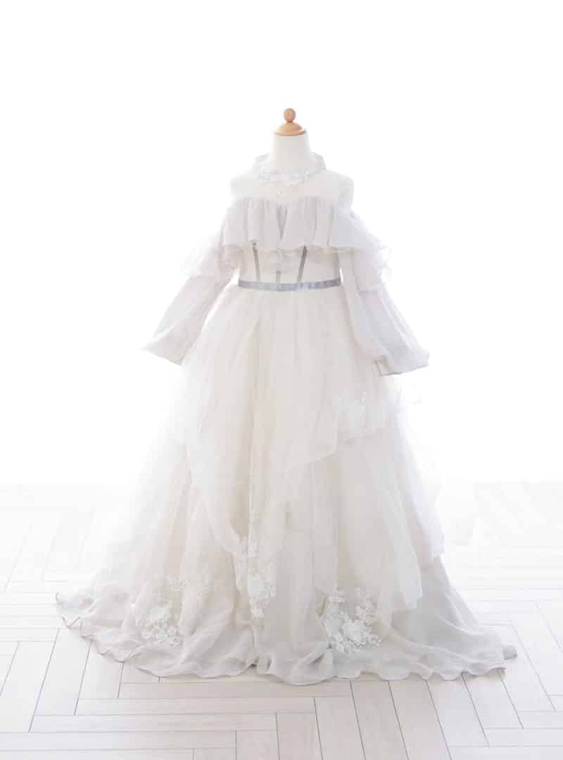オフショルダーのデザインが肩を美しく見せ可愛らしさと大人っぽさが絶妙に調和しています。ウエスト部分は軽く絞られており、スカート部分は広がるシルエットになっており歩くたびに優雅に揺れるデザインです。 このふんわりとしたスカートはまるでおとぎ話の中のプリンセスのような印象を与えます。さらに首元の繊細な装飾が華やかさも演出しています。