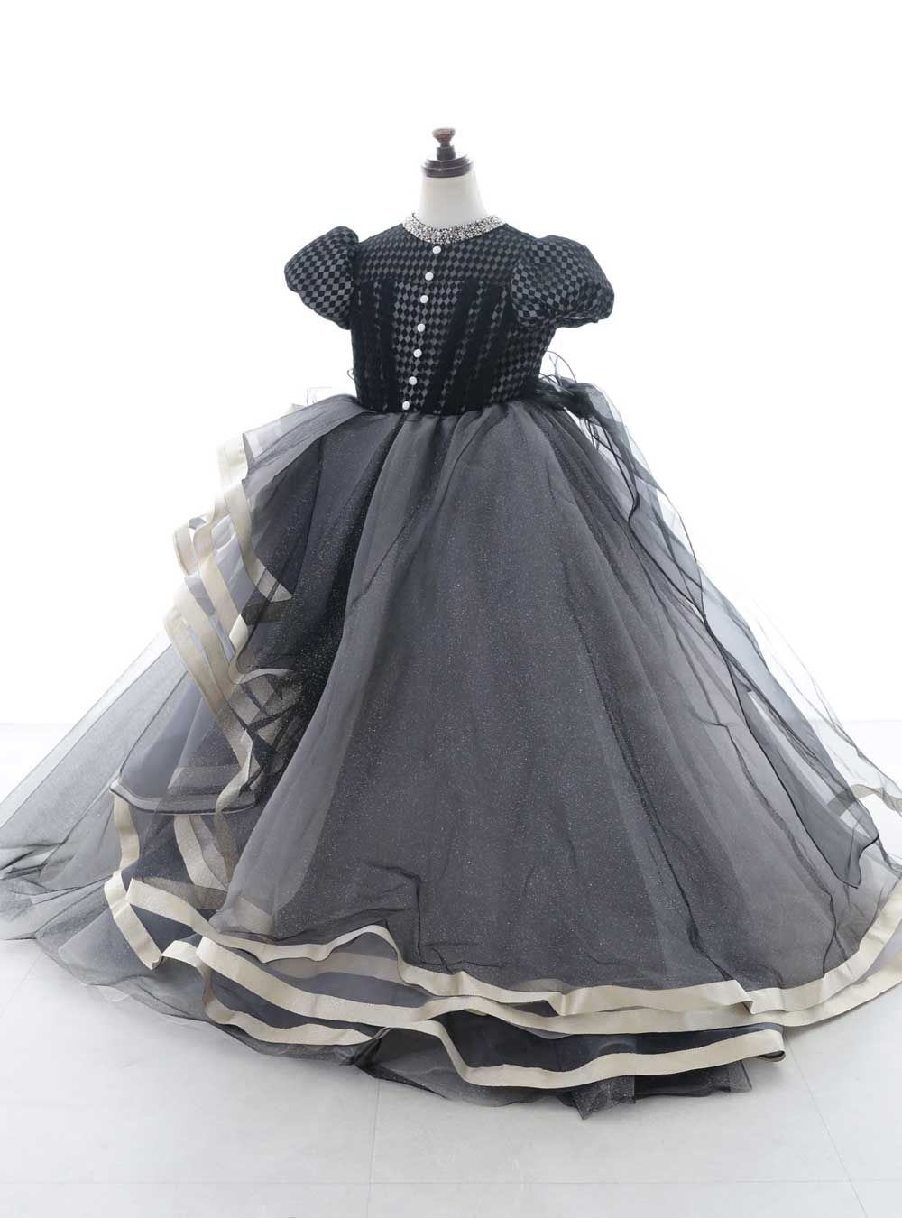 ブラックのチェックのデザインが特徴のドレスです。首元はスタンドカラーになっておりシルバーやゴールドのラインストーンが施されているためとても華やかです。上身頃はビスチェのようなデザインとパフスリーブがポイントになっておりクラシカルなデザインになっています。 プリンセスラインでふんわり広がるスカートがとても可愛くラメ感のあるチュールが上品で豪華です。ドレスの裾部分のシャンパンベージュのリボンもポイントになっています。