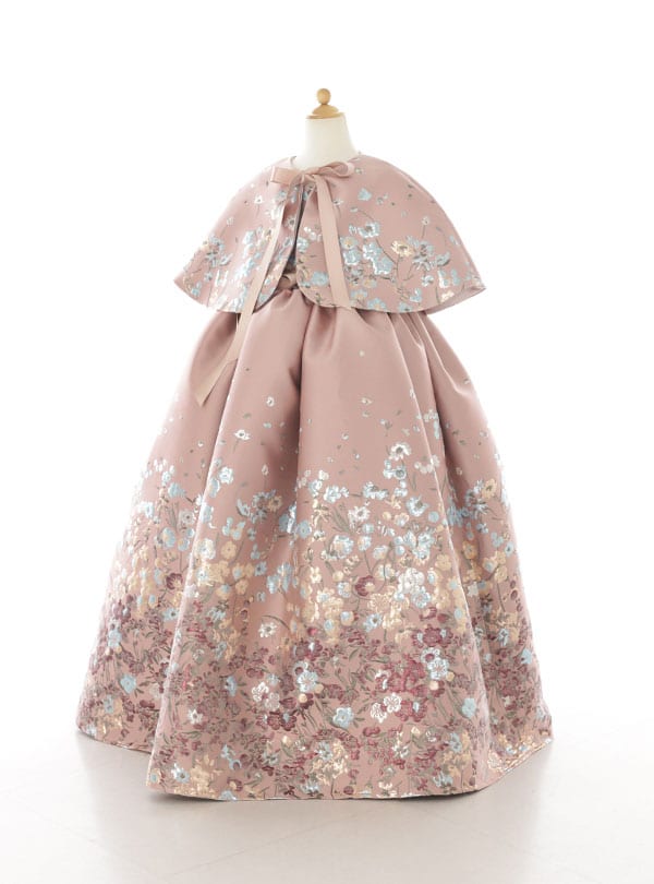 淡いピンクの生地にたくさんのお花が刺繍された衣装です。張りのある生地に光沢感のある刺繍が施されているので、上品なデザインになっております。 ショートケープを付けると全体的にふんわりとした華やかな印象になり、外すとスカートのボリューム感が際立った印象になります。まるでお花畑にいるような気分を味わうことができる1着です。
