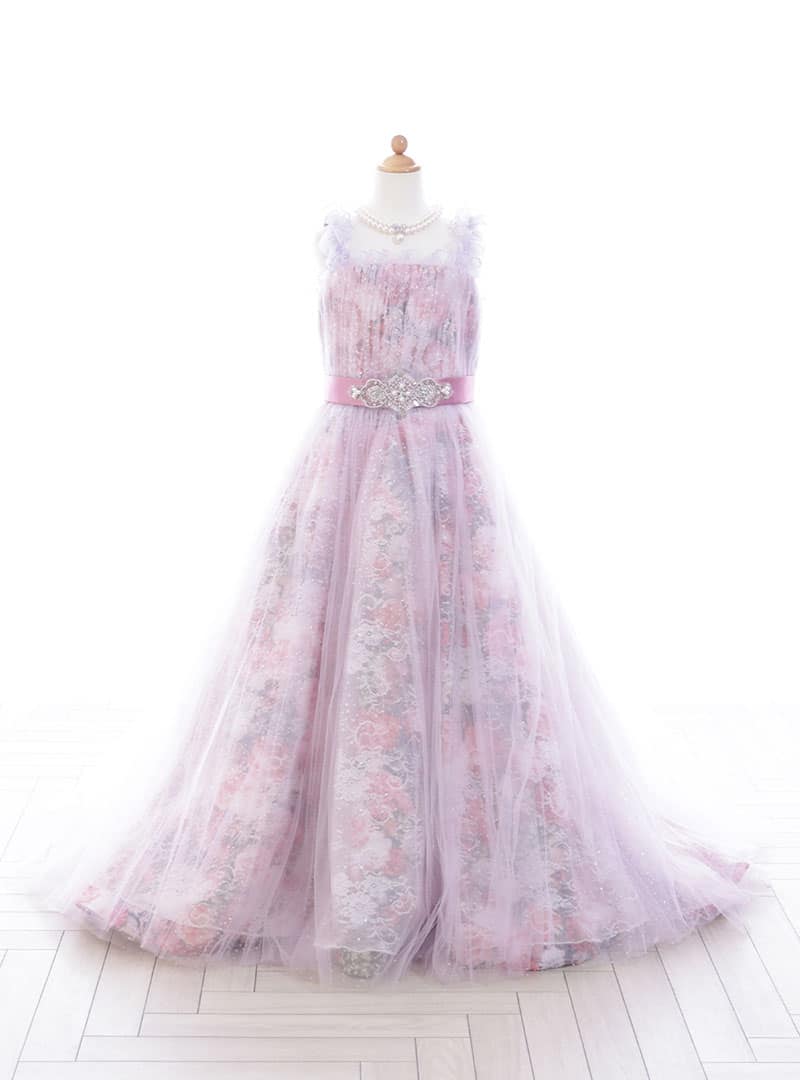 薄いパステルカラーが特徴のエレガントな一着です。 ウエスト部分には装飾的なリボンがあしらわれており、中心に輝く装飾が華やかさを引き立てます。 スカート部分には立体的なフラワーモチーフが全体に広がりボリューム感とともに優美な雰囲気を醸し出しています。また全体に薄いチュールが重ねられて、ふんわりとした印象を与えます。