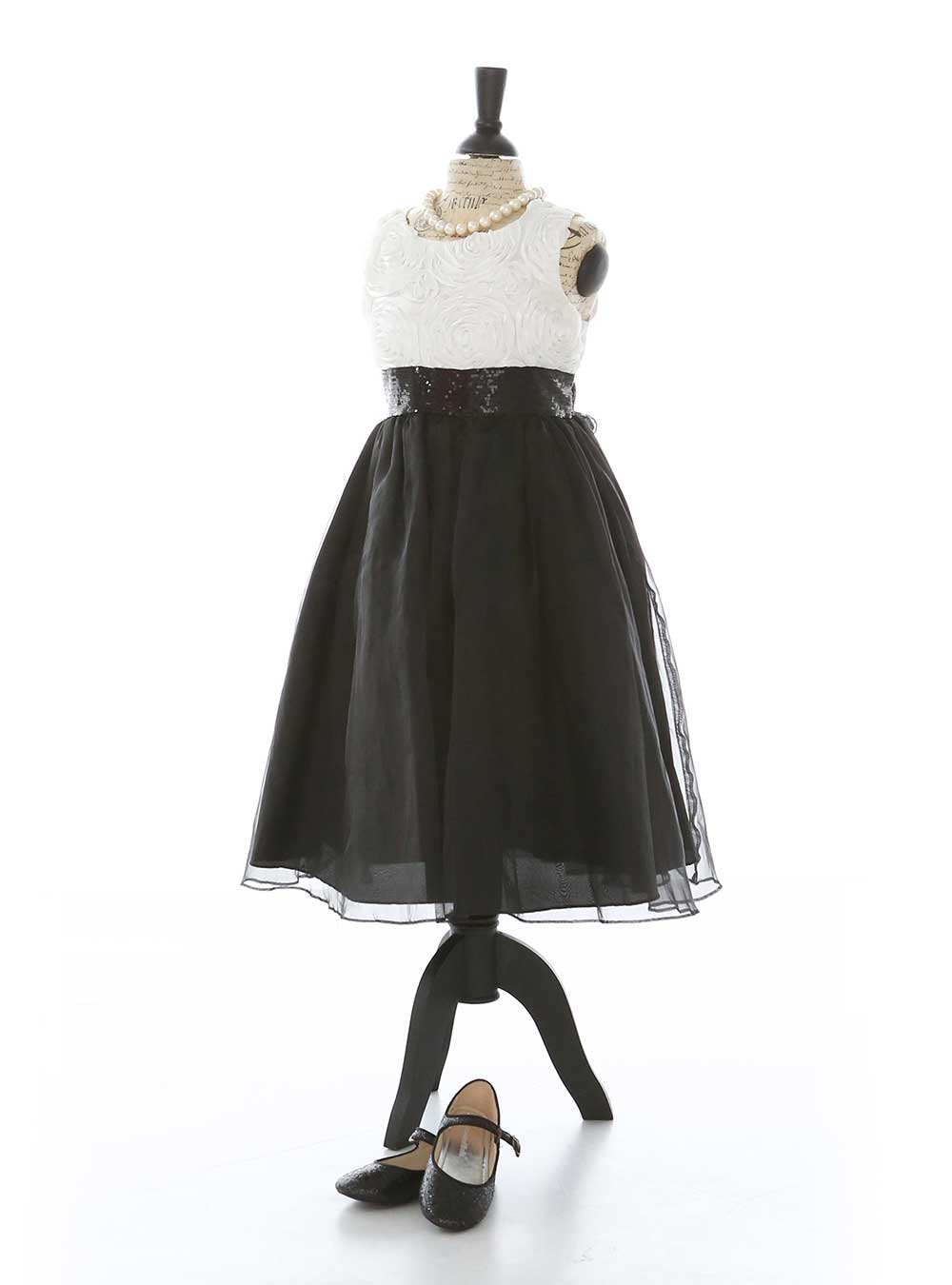 胸元が白色の花のデザインになっていてスパンコールの切り返しから下が黒色のワンピースになっているので大人っぽい雰囲気のあるフォーマルなお衣装です。 フリフリのロングドレスは苦手だけどいつもと違う雰囲気のお衣装が着たいというお子様におすすめです。 アクセサリーをシルバーストーンのものにすることで高級感も醸し出します。