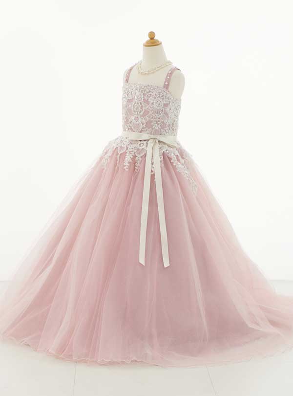 柔らかなピンク色のチュール生地を使用したフェミニンな色合いのドレス。白いサテンリボンで可愛らしくウエストマークされています。 トップスからスカート部分にかけて繊細なレース刺繍が流れるように施され上品で優しい雰囲気に!スカートはふんわりと広がるボリューム感のある人気の高いプリンセスラインです!