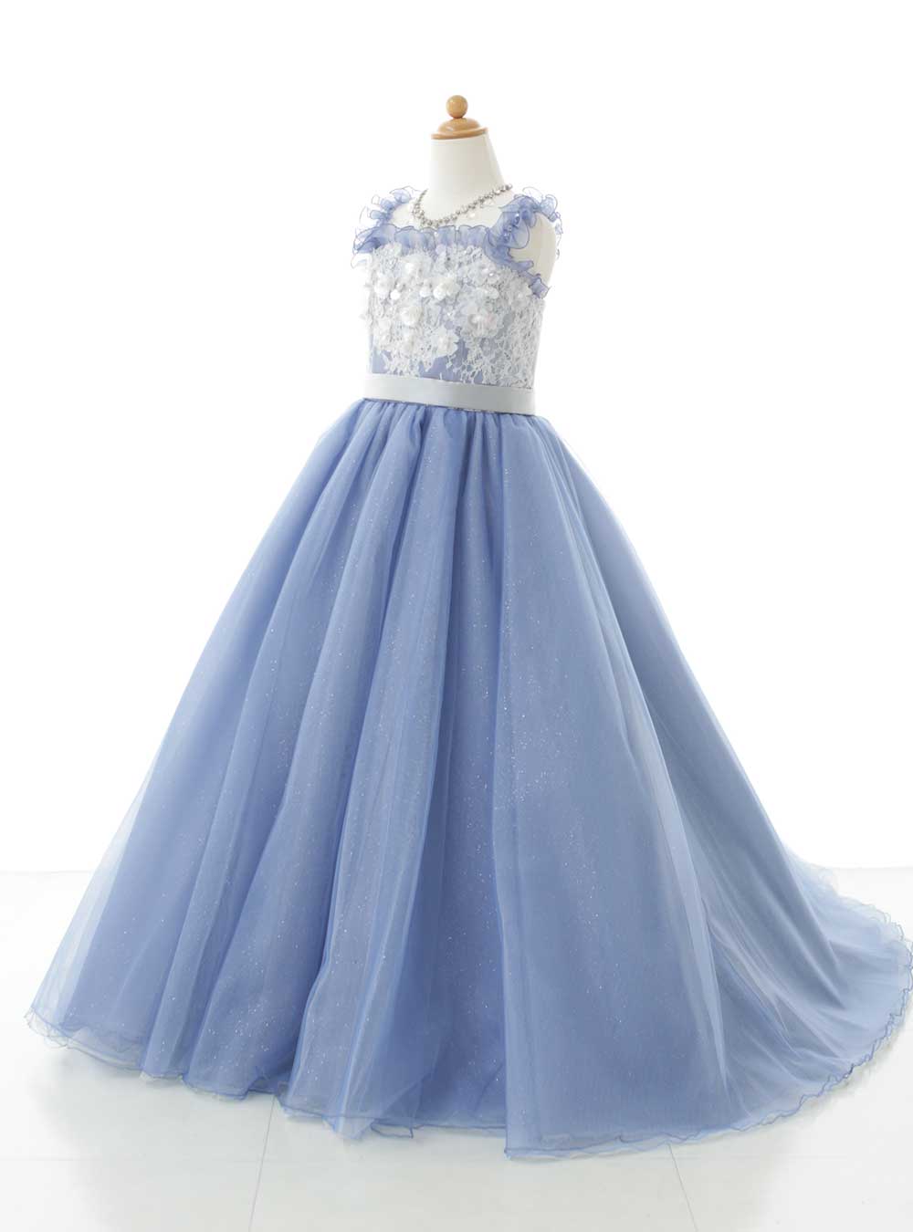 青色のボリュームのあるロングドレスです。 お色味はやや濃い青色で落ち着いた印象を与えてくれますが、肩の部分がフリルになっていたり胸元に花のビジューが施されていたりとどこか可愛らしい雰囲気も感じられるドレスになっています。 シンデレラを連想させるこのドレスはプリンセスやキラキラが大好きなお子様にぴったりのお衣装です。