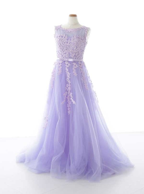 胸元には同色のお花が散りばめられており華やかさと大人っぽさが際立ちます。花が散りばめられていることによって視線を集めドレスに立体感と奥行きをもたらします。 ウエスト部分にはリボンが装飾されておりスタイルも良く見えます。紫色は落ち着きと高級感を象徴しこのドレスは洗練された大人の美しさを際立出せます。