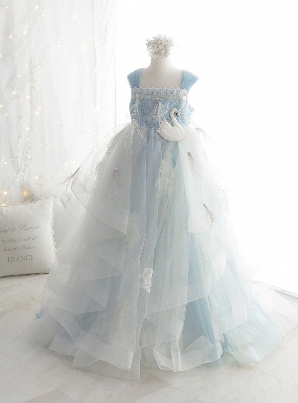 ドレス全体にふんわりとしたチュールが重なり合い優雅で軽やかな雰囲気を作り出しています。水色の色合いが清涼感を与えまるでおとぎ話のプリンセスのような印象を与えます。 さらにウエスト部分には美しいスワンが施されておりこのドレスの特別感を一層引き立てています。スワンは優雅さと純粋さの象徴でありこのドレスをまとった子供を際立たせます。