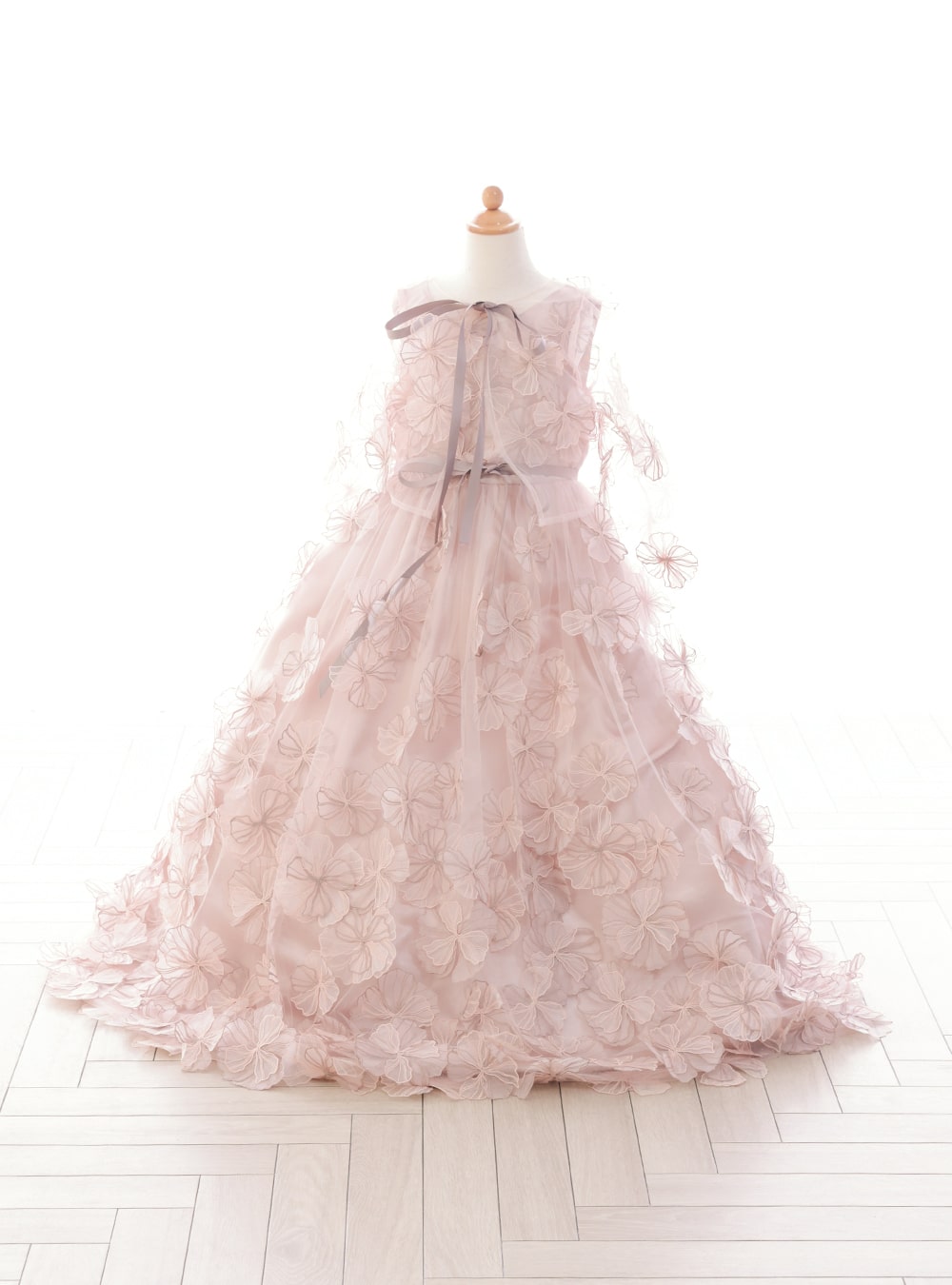 繊細な花びらの装飾が全面にあしらわれているのが特徴の1着です。ふわっと綺麗に広がるスカートが可愛らしいフェミニンな印象を与えると共にエレガントな雰囲気も兼ね備えています。 ウエスト細めのリボンが付いていて、シルエットを美しく引き締めてくれます。バックスタイルも華やかで360度どこから見ても美しいデザインになっています。