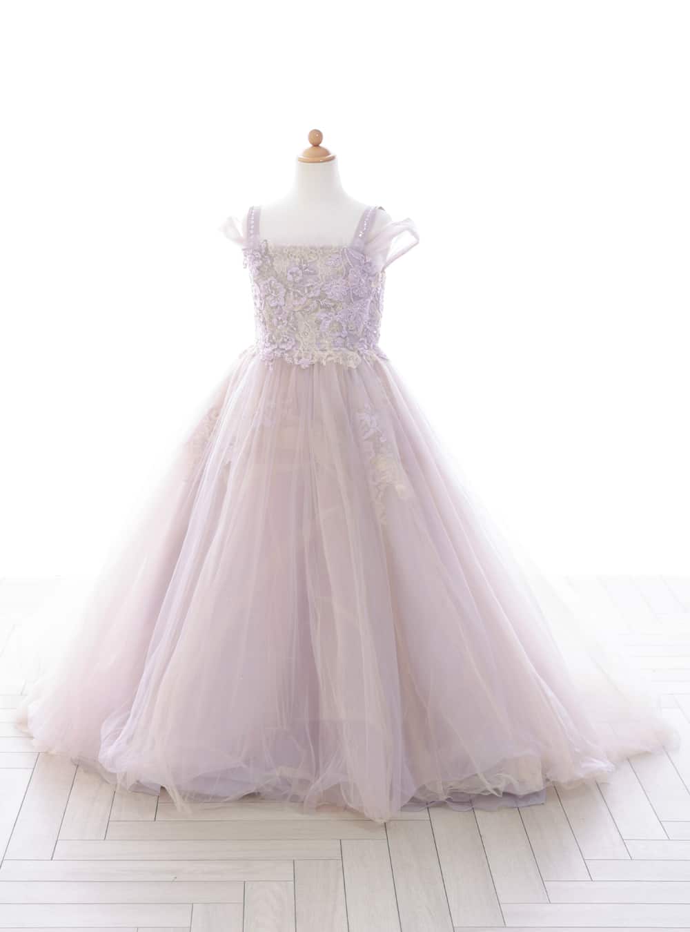 淡いピンクの色合いが魅力的な一枚です。繊細な刺繍と煌めくビーズ使いが施されており、まるでお花のような愛らしさを演出します。ロングスカートはドレープが美しく、動くたびに優雅に揺れ、美しさが際立ちます。 ウエスト部分には控えめでありながらも美しいリボンが施されており、シルエットを引き締めつつ全体の印象を柔らかくしています。