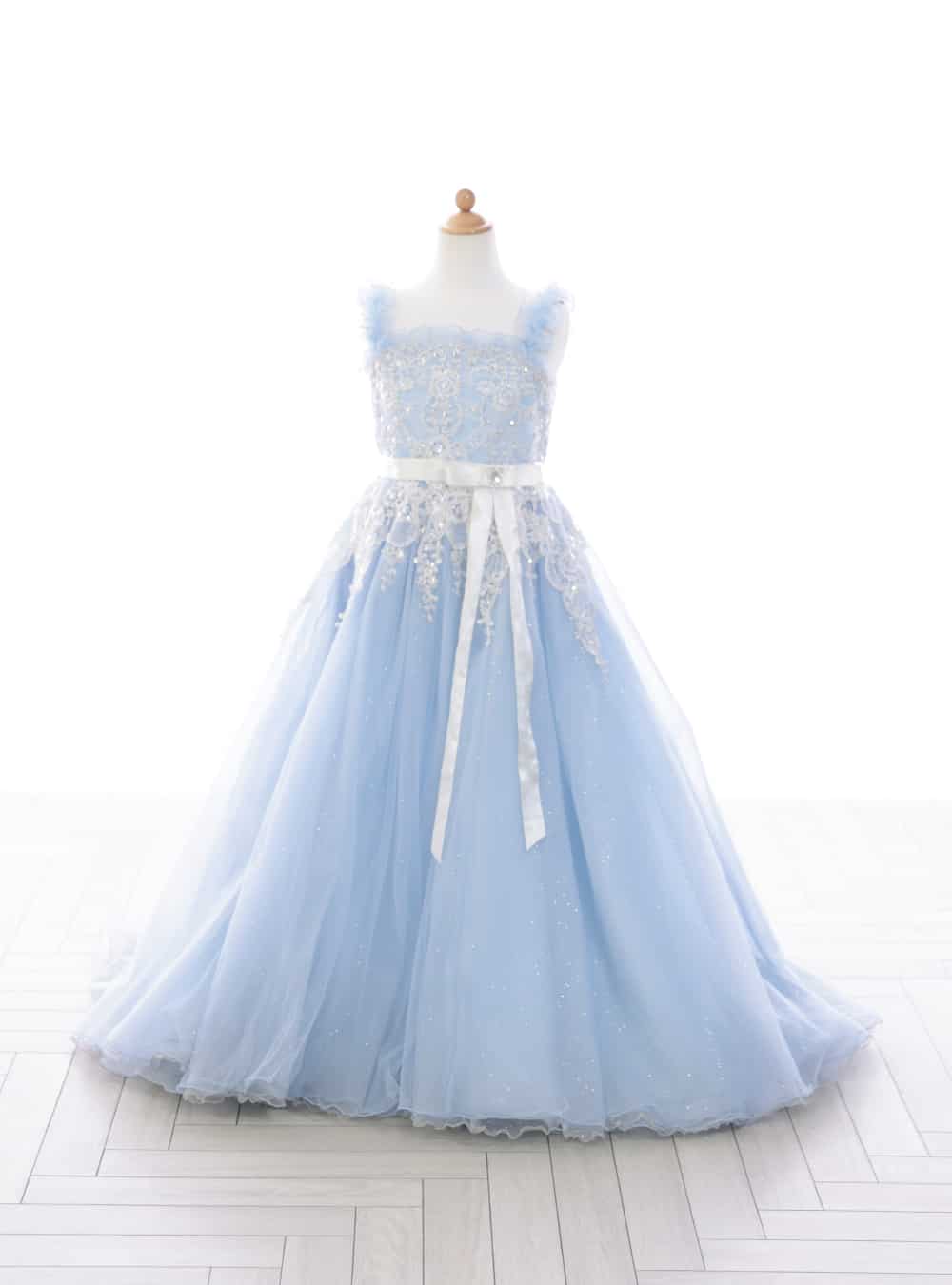 エレガントでありながらも柔らかな印象の一枚です。 淡いブルーのドレスはまるで春の花畑を思わせるような色合いで優しい印象を与えます。胸元には繊細な刺繍が施されており、アイボリーやパステルイエローのビーズがアクセントとなって華やかさをプラスしています。 ウエストにはシルクのリボンがあしらわれ、ウエストラインを美しく引き締めつつ可愛らしさを加えています。