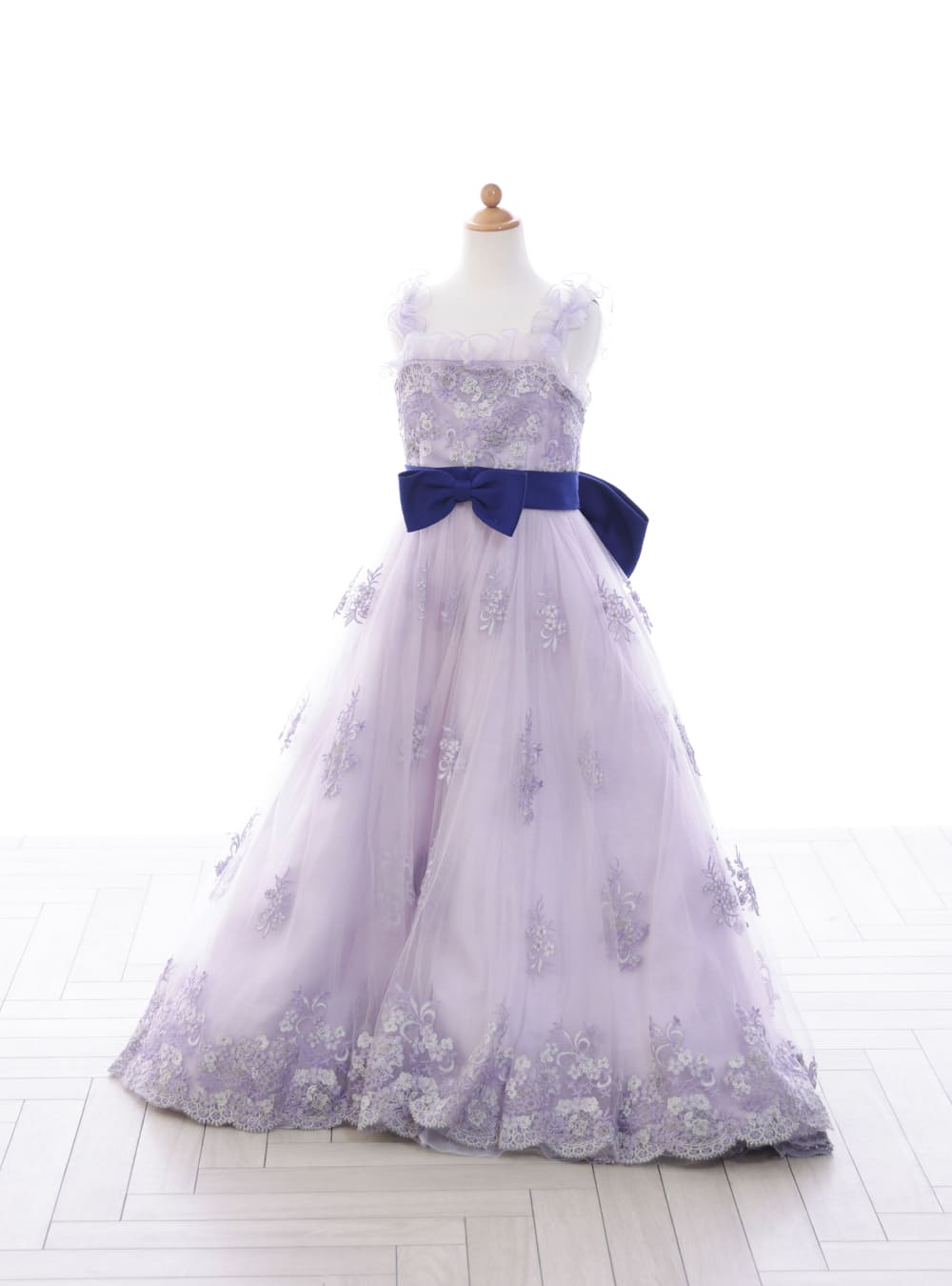 エレガントかつ魅力的なデザインの一枚です。 淡いラベンダー色のドレスはまるで春の花々のような優しい色合いで、どの角度からも目を引く美しさがあります。軽やかなチュール素材が重なり合い、動くたびに柔らかく揺れ、まるで夢の中にいるかのような印象を与えます。 胸元には繊細な刺繍が施されビーズが華やかに輝き、全体のデザインに高級感をプラスしています。ウエストにはリボンがあしらわれ、スタイルを引き締め可愛らしさを加えます。