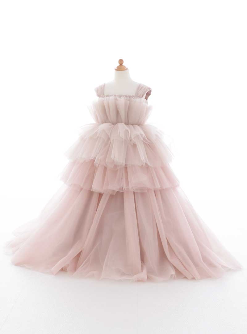 淡くやさしいピンクが印象的なドレス。何層にも重ねたチュールのティアードがふんわり広がり、動くたびに軽やかに揺れて写真でも立体感がきれいに出ます。胸元にはパールやビーズが散りばめられていて、近くで見ても上品にきらめくのが魅力。可憐さと特別感をどちらも叶えてくれる一着です。