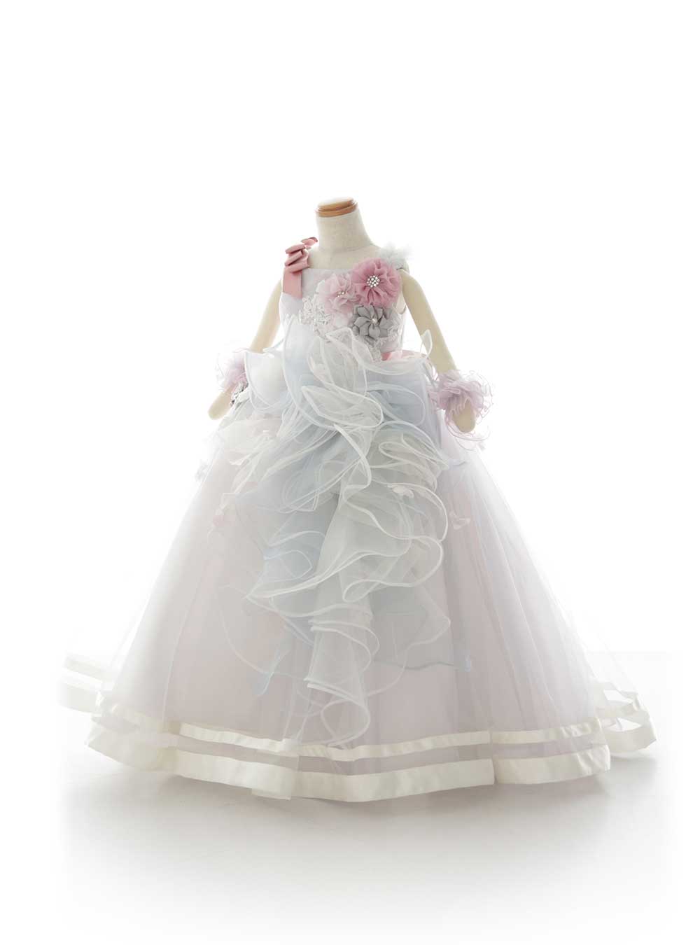 豪華なフリルが縦ラインに施されたデザインが特徴的なドレスです。胸元のピンクやグレーの花のコサージュと肩のピンクリボンがポイントになっており女の子らしく可愛い1着です。 アイスブルーの色味はすっきりとした大人っぽい印象を与えますが全体のふんわりとしたフリルの装飾が華やかで可愛らしい印象にしています。プリンセスラインのシルエットはとても人気です。