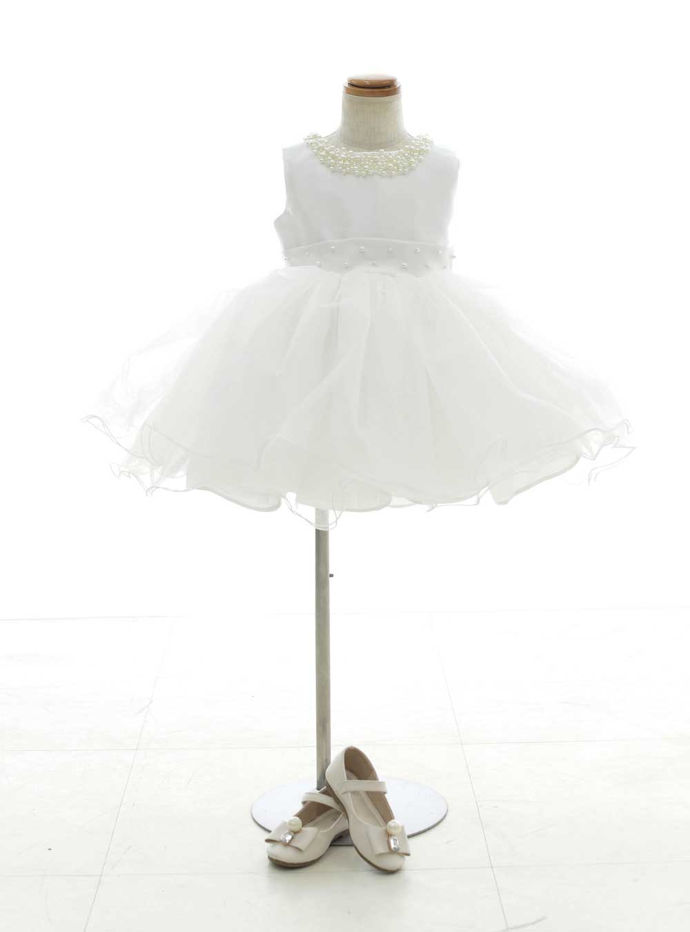 白を基調としたミニ丈のドレスです。首元のパールの装飾が目を引くデザインです。ウエストで切り替えがありスカートがふんわり広がるデザインなので可愛らしく小さなお子様にぴったりの1着です。 ミニ丈ドレスはお子様のぷくっとした可愛い足が見えるので2~3歳で人気です。全体的にシンプルなデザインなのでご家族やご兄弟撮影に参加されるお子様にもおすすめです。