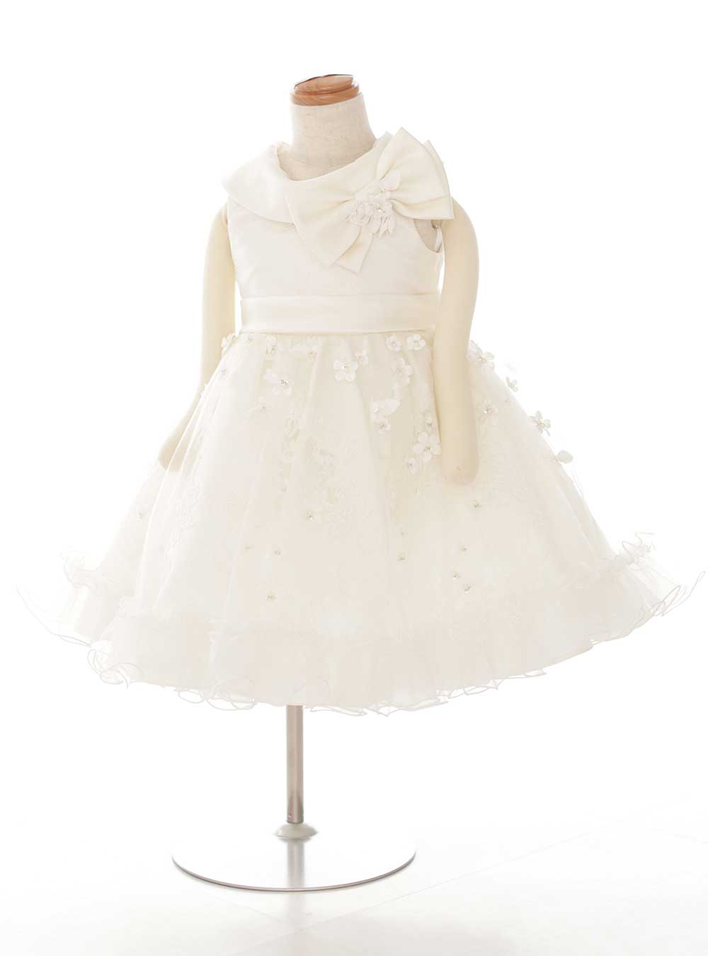 胸元の大きなリボンとスカートに施されたたくさんの花のモチーフがポイントのミニ丈ドレスです。白を基調とした上品なデザインです。襟もとはロールカラーになっておりクラシカルな印象です。 ウエスト部分で切り替えがありドレスがふんわり広がるタイプなので女の子らしく可愛らしい1着です。上品でクラシカルな雰囲気が好きな方におすすめです。