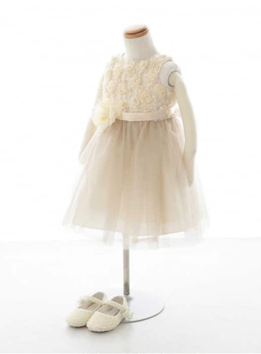 ベージュを基調としたシンプルなワンピースです。胸元にデザインされている沢山の花のモチーフが女の子らしいデザインです。ウエスト部分のコサージュもポイントです。 スカートはラメが入ったチュールが広がり子供らしい雰囲気が引き立ちます。落ち着いた上品なワンピースなのでご家族やご兄弟撮影に参加されるお子様にもおすすめです。