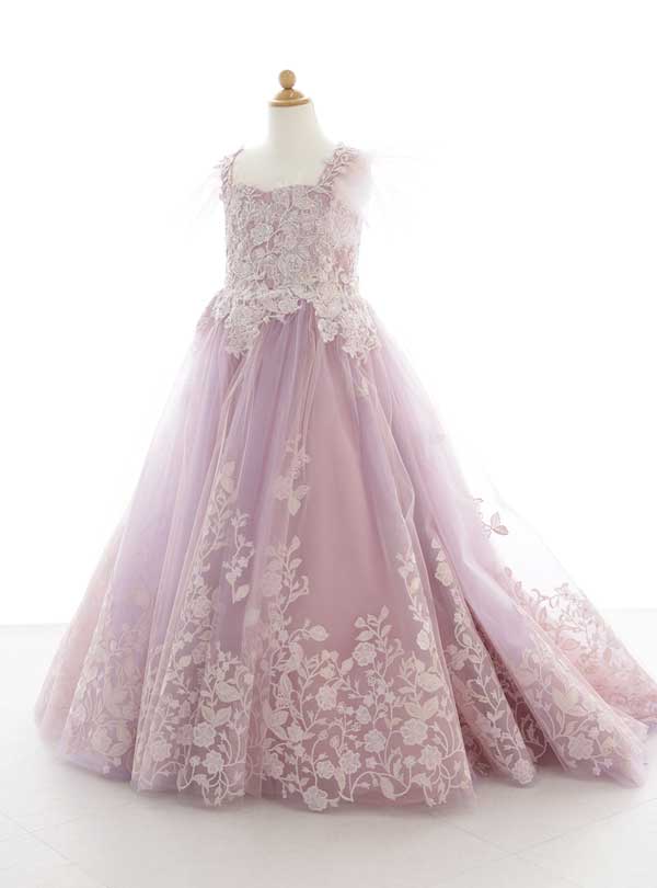 上品なチュールと刺繡のデザインが施されているドレスです。くすみピンクカラーのドレスに上品な花のデザインのレースがふんだんに施された豪華な1着です。 Aラインのシルエットは落ち着いた印象を与えます。スカートの部分はチュールが何層にも重なっています。裾部分にあしらわれた白の花の刺繡も印象的で上品で可愛いデザインです。くすみカラーが好きな方におすすめです。