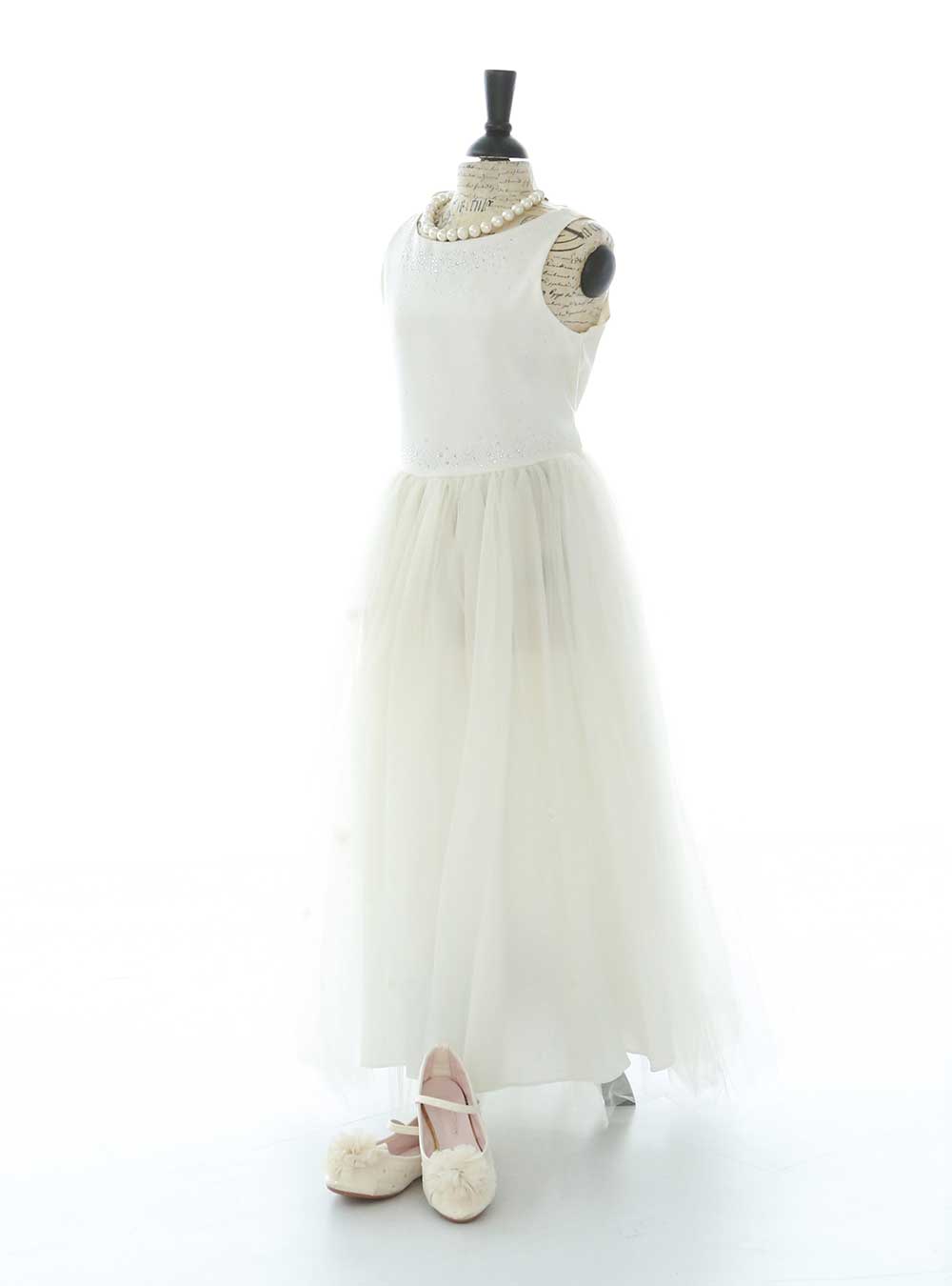 純白のシンプルでエレガントなデザインが特徴です。トップスはシンプルなノースリーブで、繊細な装飾が施されています。ウエストからふんわりと広がるチュールスカートが、軽やかな動きを演出し、全体に柔らかな雰囲気を与えます。 パールのネックレスとバレエシューズ風のシューズがアクセントとなり、清楚で品のあるスタイリングに仕上がっています。